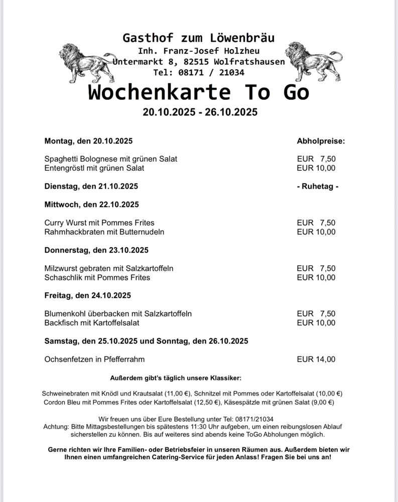 Wir bieten täglich wechselnde Tagesgerichte sowie einen umfangreichen Catering-Service für jeglichen Anlass (Hochzeit, Geburtstage, Firmen & Vereinsfeiern und viele mehr).